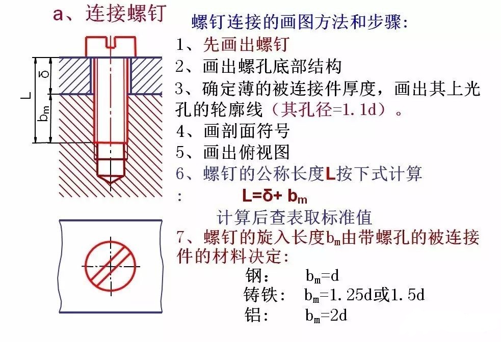 螺钉一般用于受力不大而又不需经常拆卸的地方。被连接零件中的一个加工出螺孔,其余零件都加工出通孔,如图所示。